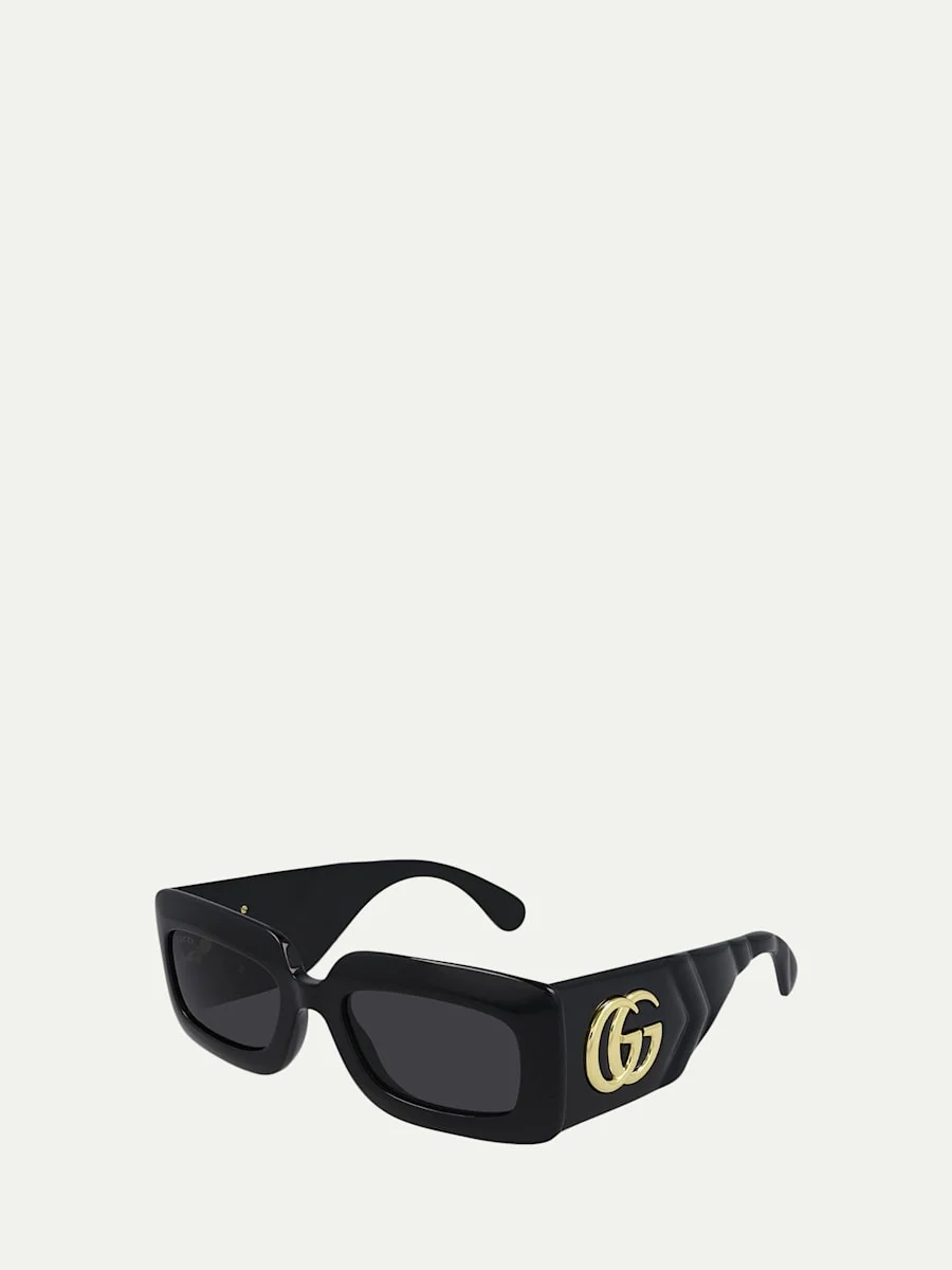 Gucci acetate sunglasses with textured arms. Lens/bridge/temple (in mm): 53-21-145. Oversized rectangle frames. Extra-wide, tapered arms with interlocking GG logo. 100% UVA/UVB protection. Injected plastic. Made in Italy. Proposition 65 warning for California residents Online Inquiries: BGS21_D3UGB| Store Inquiries: #3674620