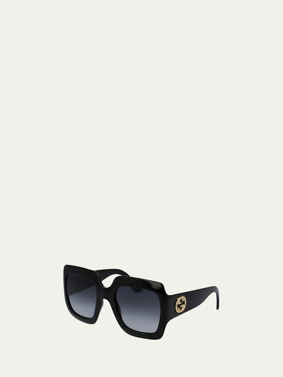 Gucci square sunglasses, recalling vintage inspiration. Lens/bridge/temple (in mm): 54-25-140. Optyl® plastic frames. Gradient square lenses; logo embossed at right. Interlocking GG temples. Chunky, tapered arms. 100% UVA/UVB protection. Can be fitted with prescription lenses. Made in Italy. Online Inquiries: BGS21_D2H65| Store Inquiries: #2076389