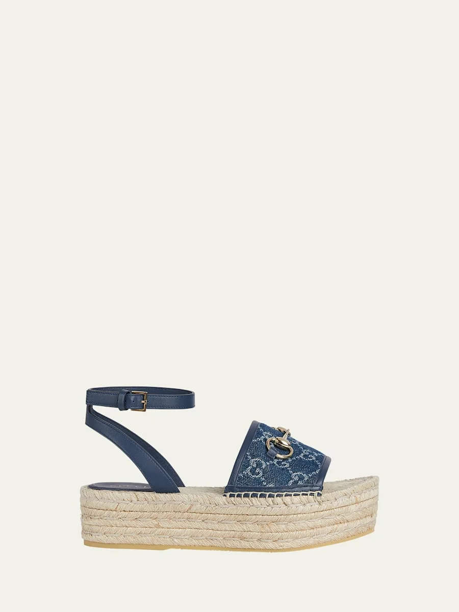 Gucci "Paloma" espadrille sandals in GG cotton denim with calf leather trim and a golden bit strap 1.25 in / 30 mm platform braided-jute heel; 1.00 in / 25 mm platform Open toe Wide band upper Adjustable ankle strap Rubber outsole Spot clean, professional cleaning recommended Made in Spain Size Note: Runs true to size. Online Inquiries: BGS21_X6S78| Store Inquiries: #4927705