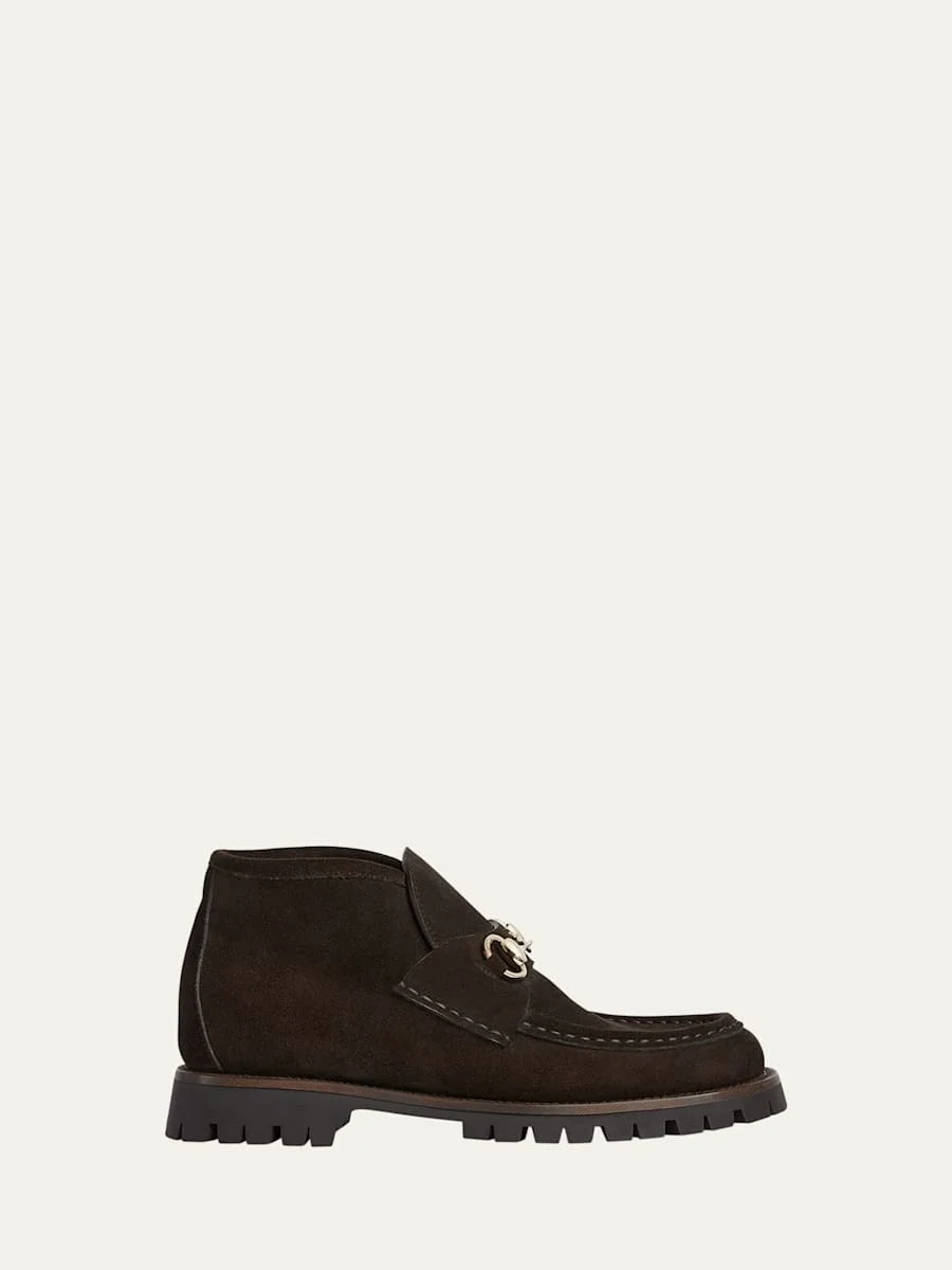 Gucci suede booties with signature horsebit accent 0.25 in / 10 mm flat heel Round moc toe Notched vamp Slip-on style Rubber outsole Lining: Leather Spot clean, professional cleaning recommended Made in Italy Online Inquiries: BGS21_X6XWS| Store Inquiries: #5044554