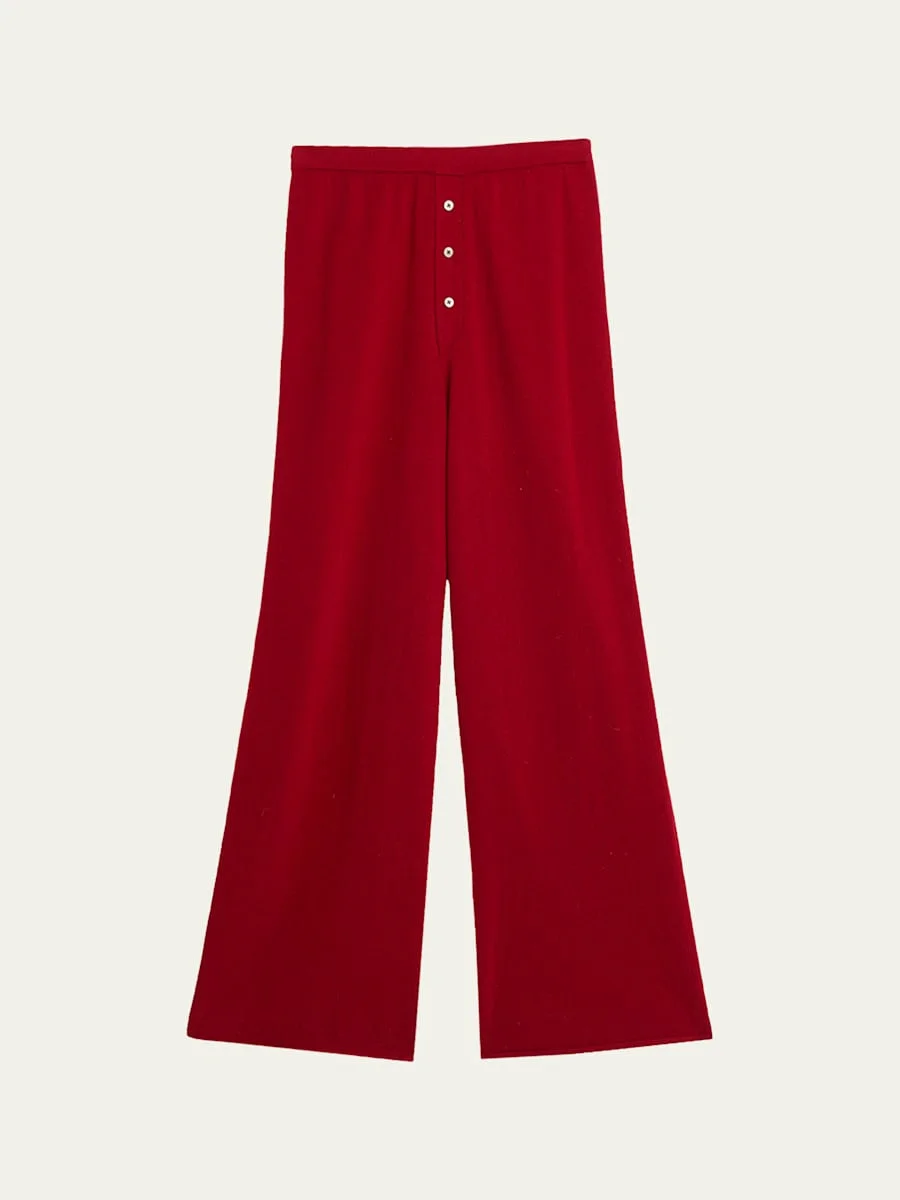 Guest in Residence "Everywear" lightweight knit pants with a three-button placket faux closure Approx. measurements: 11.5" rise; 30.375" inseam; 42" outseam Mid rise Relaxed fit through straight legs Full length Pull-on style Cashmere Dry clean Imported Model is 5'10"/177cm. Online Inquiries: BGS21_T8Q8W| Store Inquiries: #4646649
