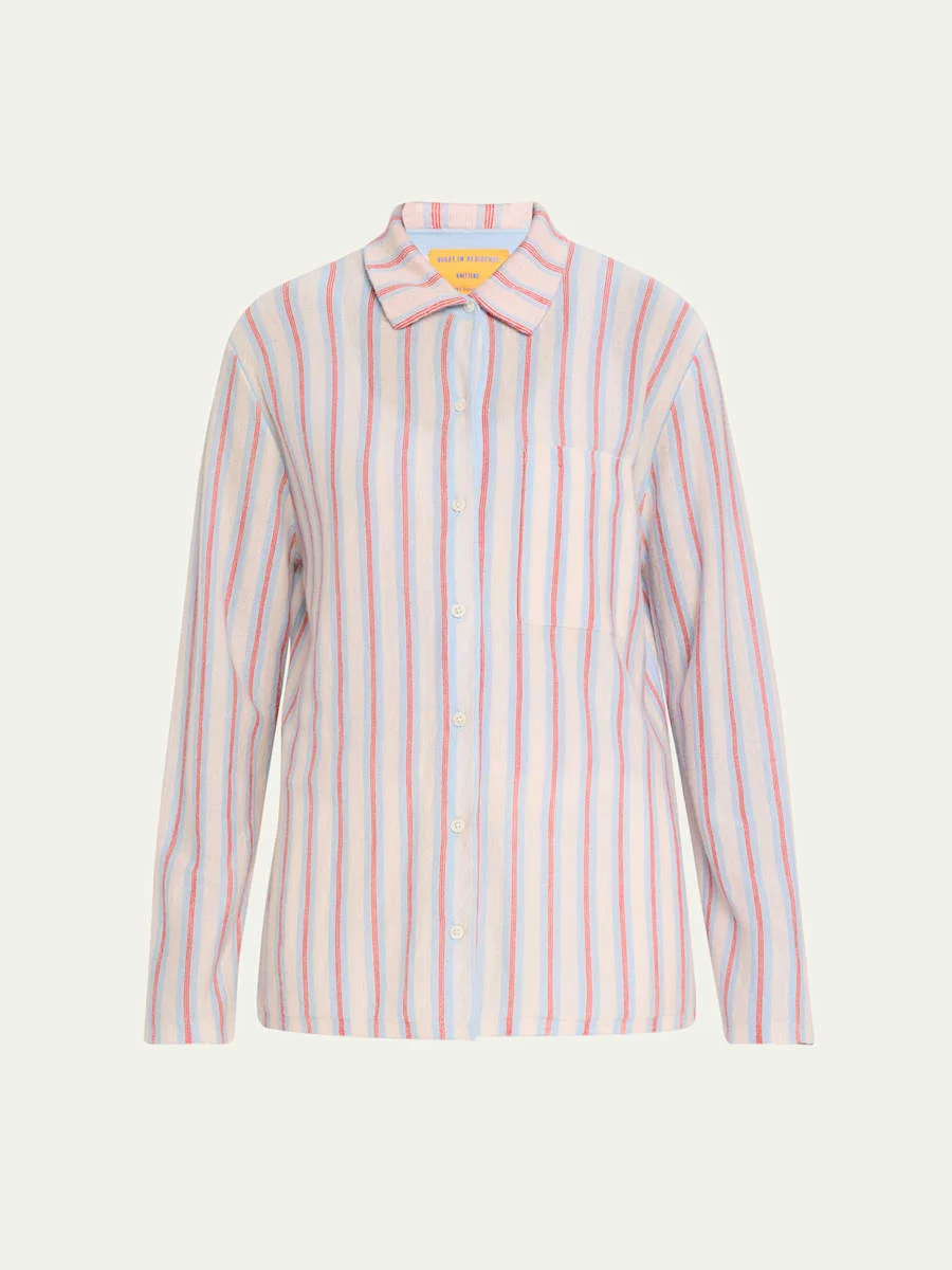 Guest in Residence's "Fine Stripe Showtime" shirt is crafted from featherweight cashmere with soft, understated stripes Approx. 22.8"L from shoulder to hem Shirt collar; button front Long sleeves; button cuffs Single chest patch pocket Relaxed fit Hip length Cashmere Imported