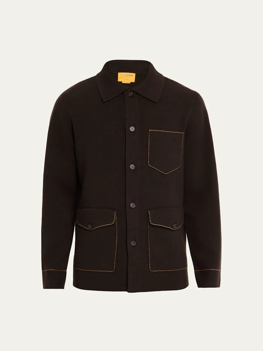 Guest in Residence work jacket in cashmere with contrast topstitching Point collar Button placket Chest patch pocket Hip flap pockets Long sleeves Hand wash cold, dry clean Cashmere Imported