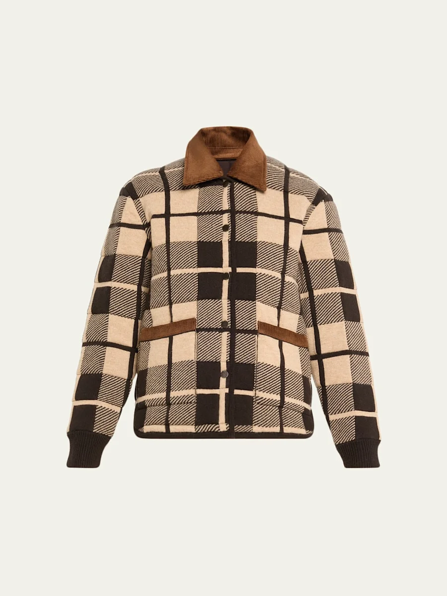 This quilted plaid liner jacket by Guest in Residence is crafted from a woolcashmere blend with a detachable corduroy collar Reverses from plaid jacquard knit to solid quilting Point collar; snap button front Long sleeves; ribbed cuffs Front patch pockets Relaxed fit Hip length Curved shirttail hem Wool/cashmere Imported