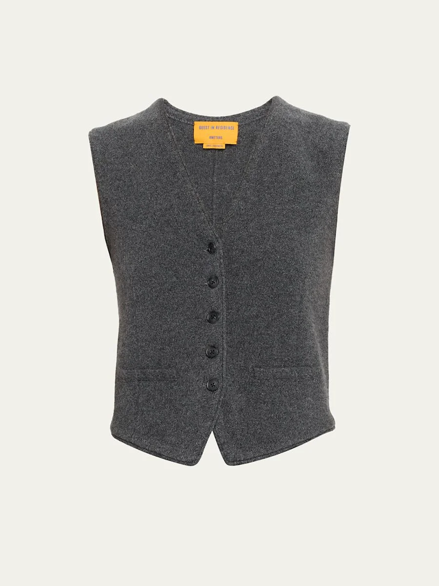Guest in Residence vest boasts a rear cinch strap Approx. 21"L from shoulder to hem V neckline Button front Front welt pockets Cropped length Cashmere Dry clean Imported