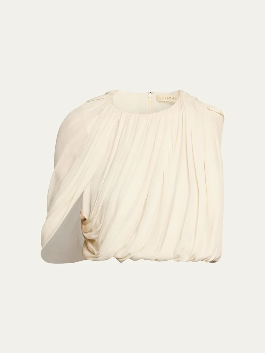 Heirlome "Marie" top is crafted from gathered silk georgette accented with a shoulder drape Round neckline Sleeveless Loose fit Cropped length Invisible back zip Silk Lining: Silk Dry clean Imported
