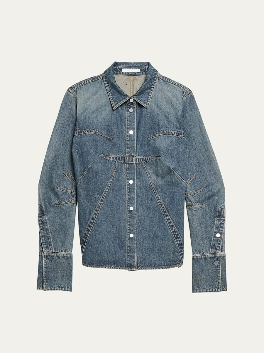 Helmut Lang denim apex shirt with dart detailing for added shape Point collar Long sleeves with snap cuffs; approx. 34"L Slim fit Hem sits at the hip Snap-front Cotton Lining: Viscose Machine wash cold Imported Online Inquiries: BGS21_T6NMM| Store Inquiries: #5021773
