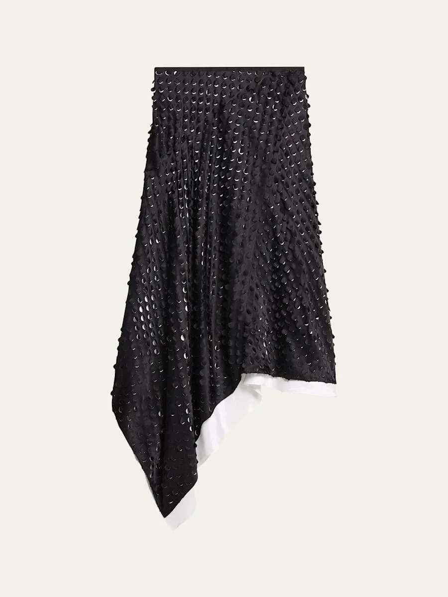 Helmut Lang layered scarf skirt featuring lasercut detailing High rise Asymmetric silhouette Hem falls below the knee Side zip Viscose/rayon/cellulose acetate Lining: Viscose Spot clean Imported