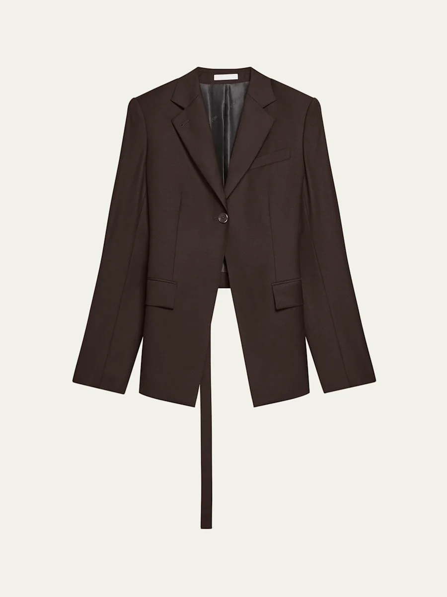 Helmut Lang wool blazer featuring a cut-away front and back Notched lapels Single-breasted front Long sleeves with button cuffs; approx. 33.5"L Adjustable back strap Chest welt pocket Hip flap pockets Tailored fit Button-front Wool Lining: Viscose Dry clean Imported Online Inquiries: BGS21_T6Z0M| Store Inquiries: #5072142