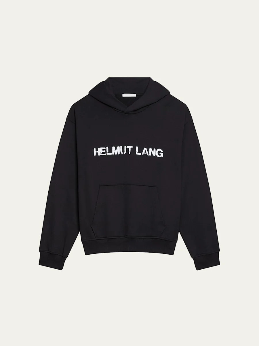 The Helmut Lang hoodie showcases a painted stencil logo on the front for an edgy finish. Approx. 27 3⁄4"L from shoulder to hem Hooded neckline Kangaroo pocket Dropped shoulders Long sleeves Ribbed cuffs and hem Pullover style Relaxed fit Cotton Machine wash cold Made in Portugal