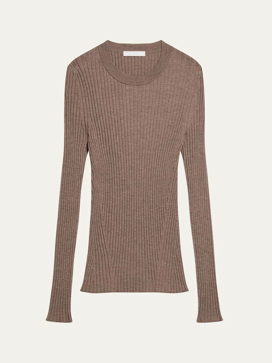 Helmut Lang ribbed wool top enhanced with an open back Crew neckline Long sleeves; approx. 32.3"L Easy fit Hem sits at the hip Pullover style Wool Unlined Dry clean Imported