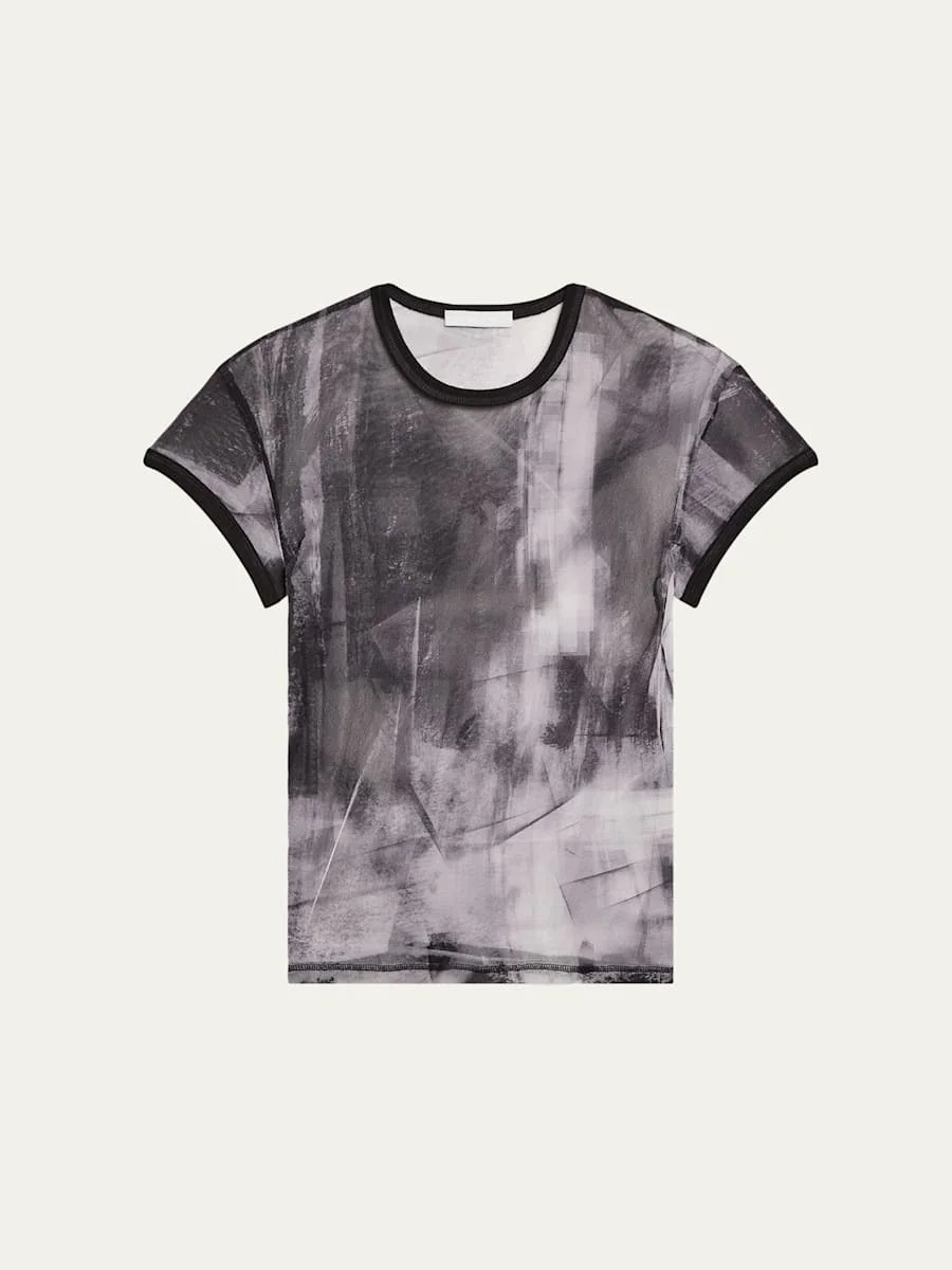 Helmut Lang printed sheer mesh top Crew neckline Short sleeves; approx. 10.9"L Slim fit Hem sits at the hip Pullover style Nylon/polyamide Unlined Hand wash Imported Online Inquiries: BGS21_T6F0D| Store Inquiries: #4972937