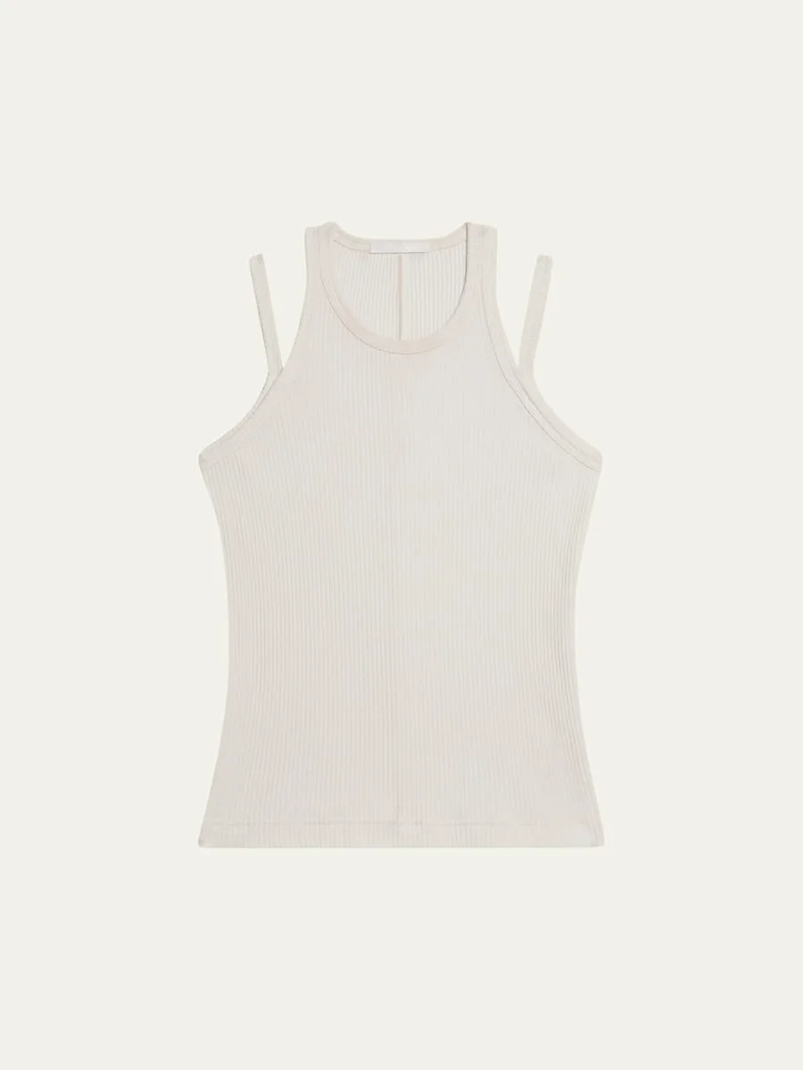 Crafted from a ribknit fabric, this tank top by Helmut Lang features a doubled strap design Crew neckline Sleeveless Slim fit Hip length Pullover style Cotton/spandex Dry clean Imported