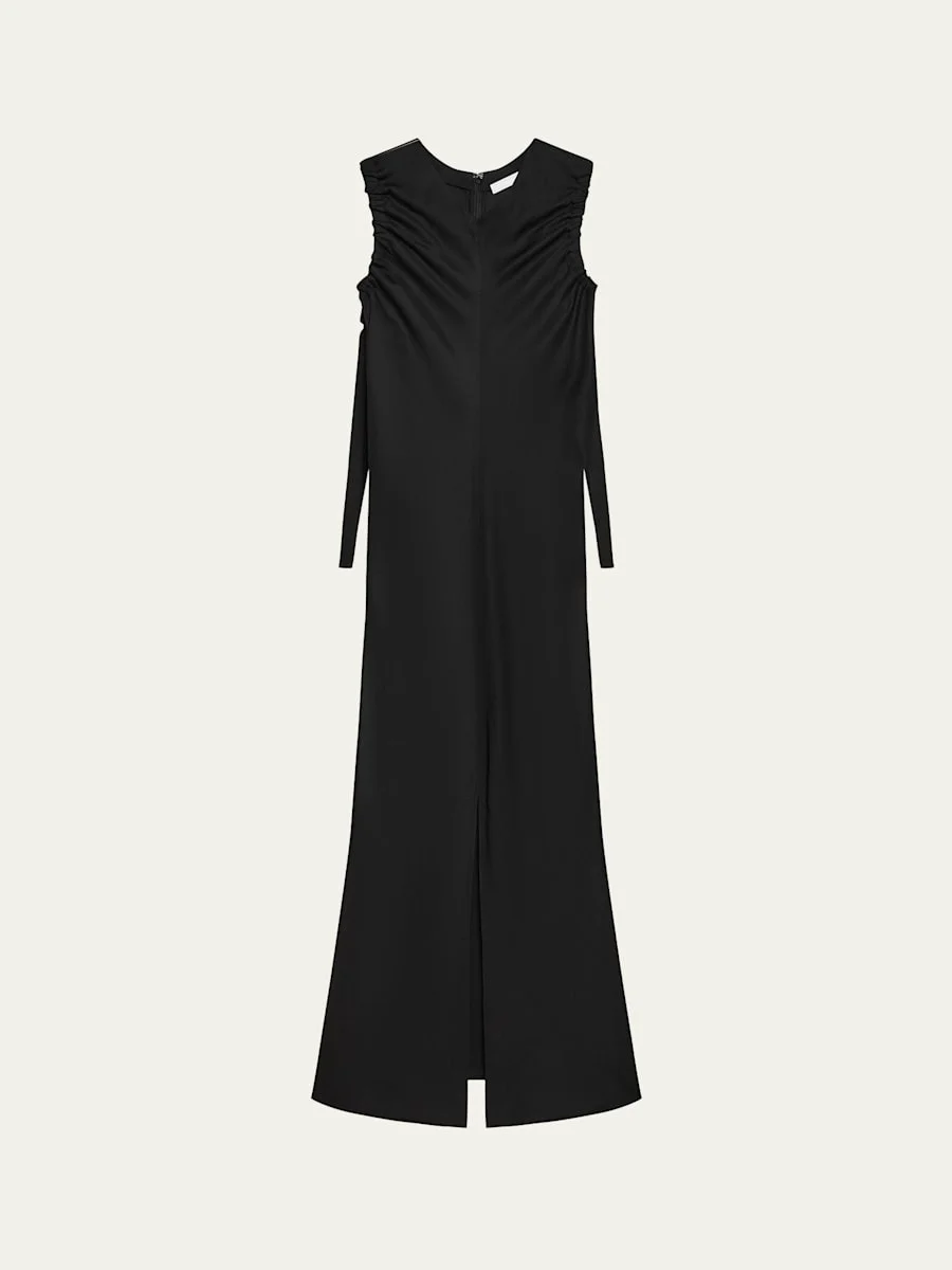 Helmut Lang maxi dress enhanced with adjustable ruched arm holes V neckline Sleeveless Shift silhouette Full length Center back zip Rayon/cellulose acetate Unlined Dry clean Imported Online Inquiries: BGS21_T6Z0W| Store Inquiries: #5072152