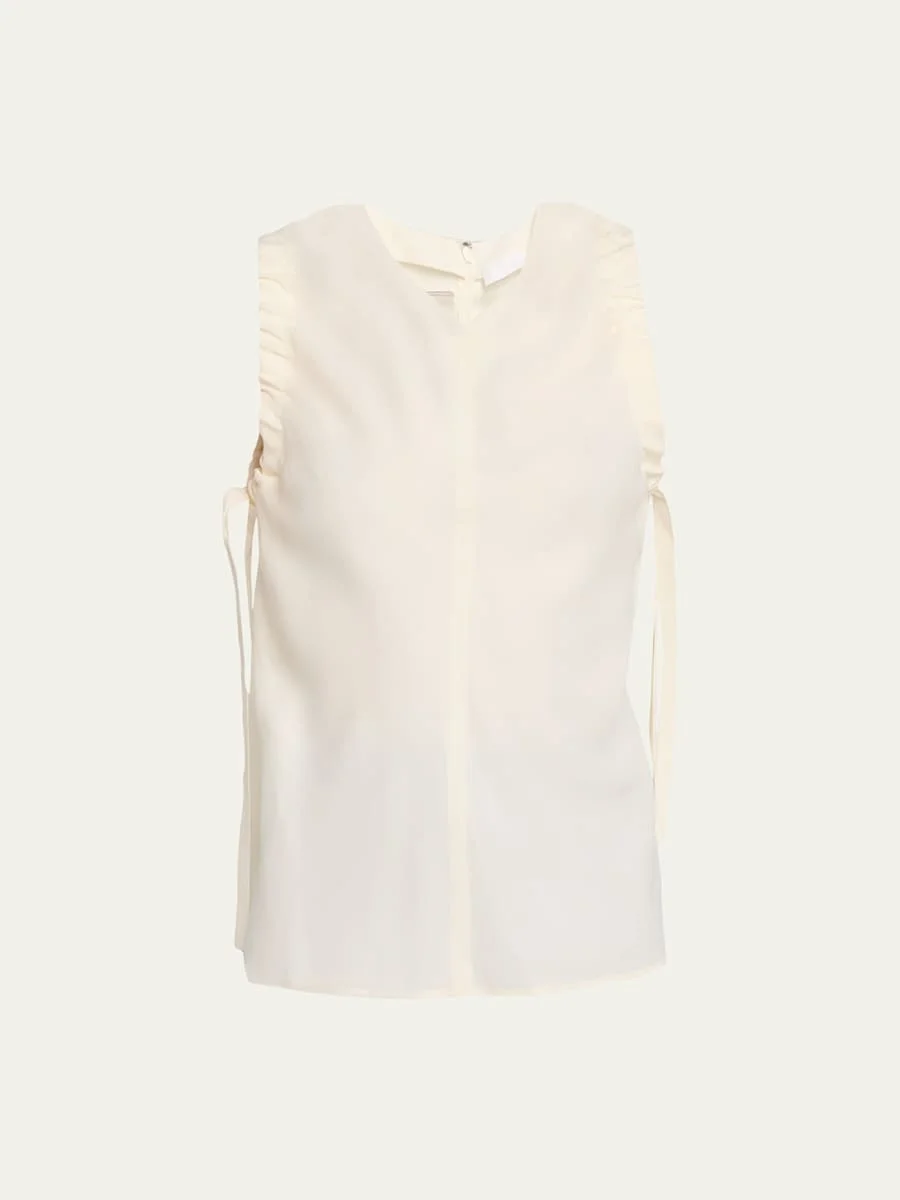 Helmut Lang top enhanced with adjustable ruched arm holes V neckline Sleeveless Easy fit Hem sits at the hip Center back zip Rayon/cellulose acetate Unlined Dry clean Imported Online Inquiries: BGS21_T6Z0X| Store Inquiries: #5072153