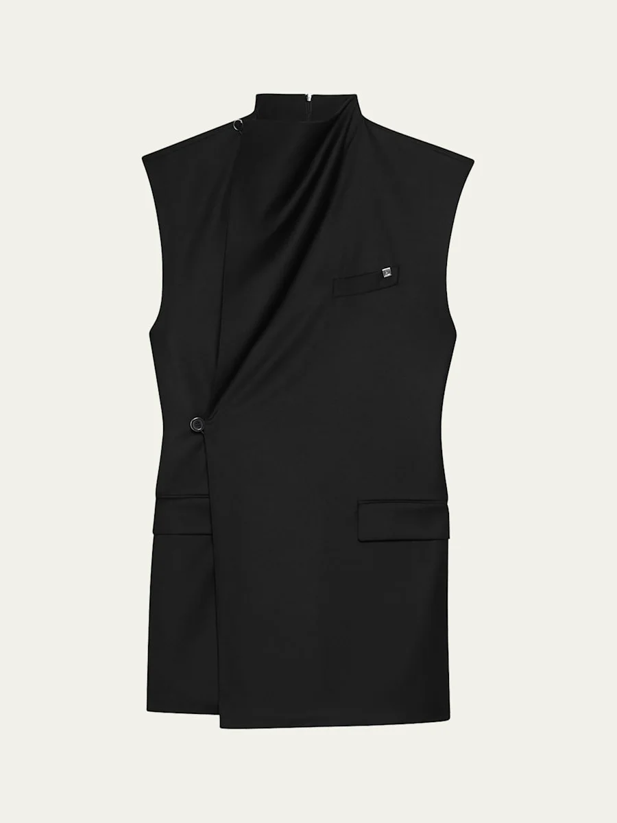 Helmut Lang blazerinspired wool mini dress High cowl neckline Sleeveless Chest welt pocket Adjustable back tie Hip flap pockets Wrap silhouette Hem falls above the knee Button closure Wool Lining: Viscose Dry clean Imported