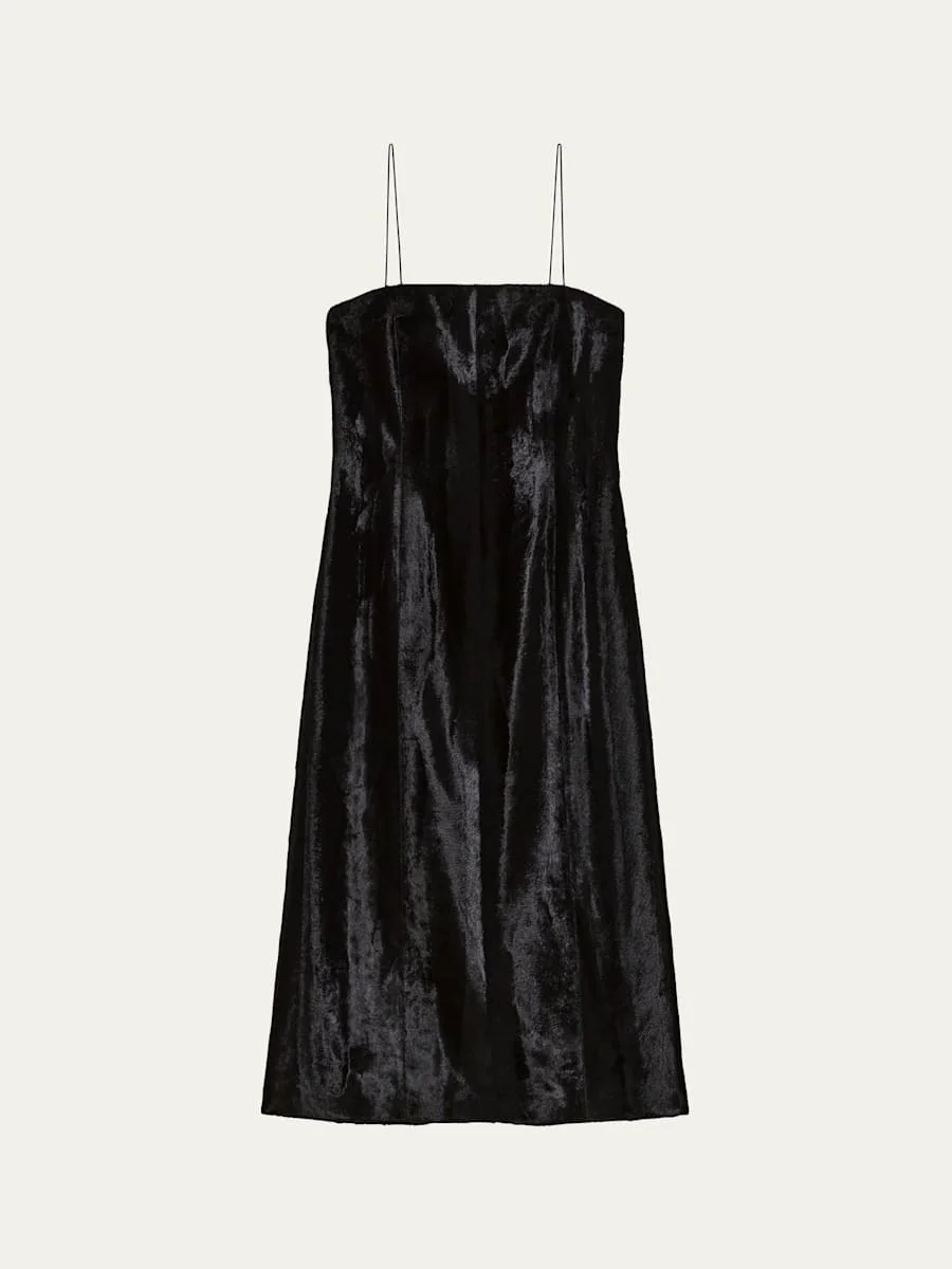 Crafted in faux pony hair, this Helmut Lang midi dress features removable spaghetti straps and a refined, structured silhouette. Strapless neckline Sleeveless Center back slit Invisible side zip Rayon/cellulose acetate/cotton Dry clean Imported