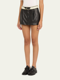 HOMMEGIRLS skirt is crafted from smooth lambskin leather with front pleats and finished with a belted contrasting flipover waistband, striking a bold balance of structure and edge. Mid waist Back buttonwelt pockets Mini length Skirt falls straight from hip to hem Hook/zip fly Leather Made in Italy