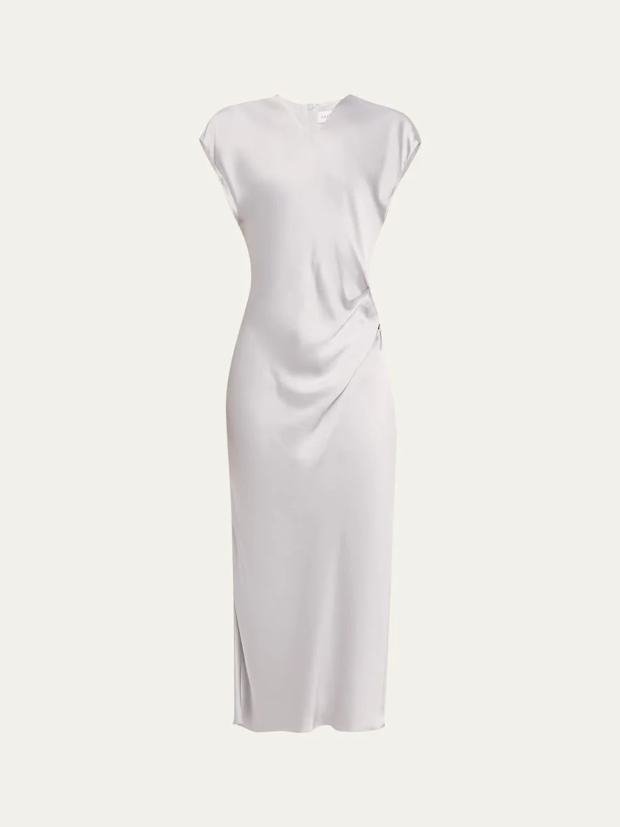 House of Dagmar dress crafted from fluid satin viscose V neckline Cap sleeves Draped silhouette Hem falls below the knee Center back zip Viscose Dry clean Made in Portugal