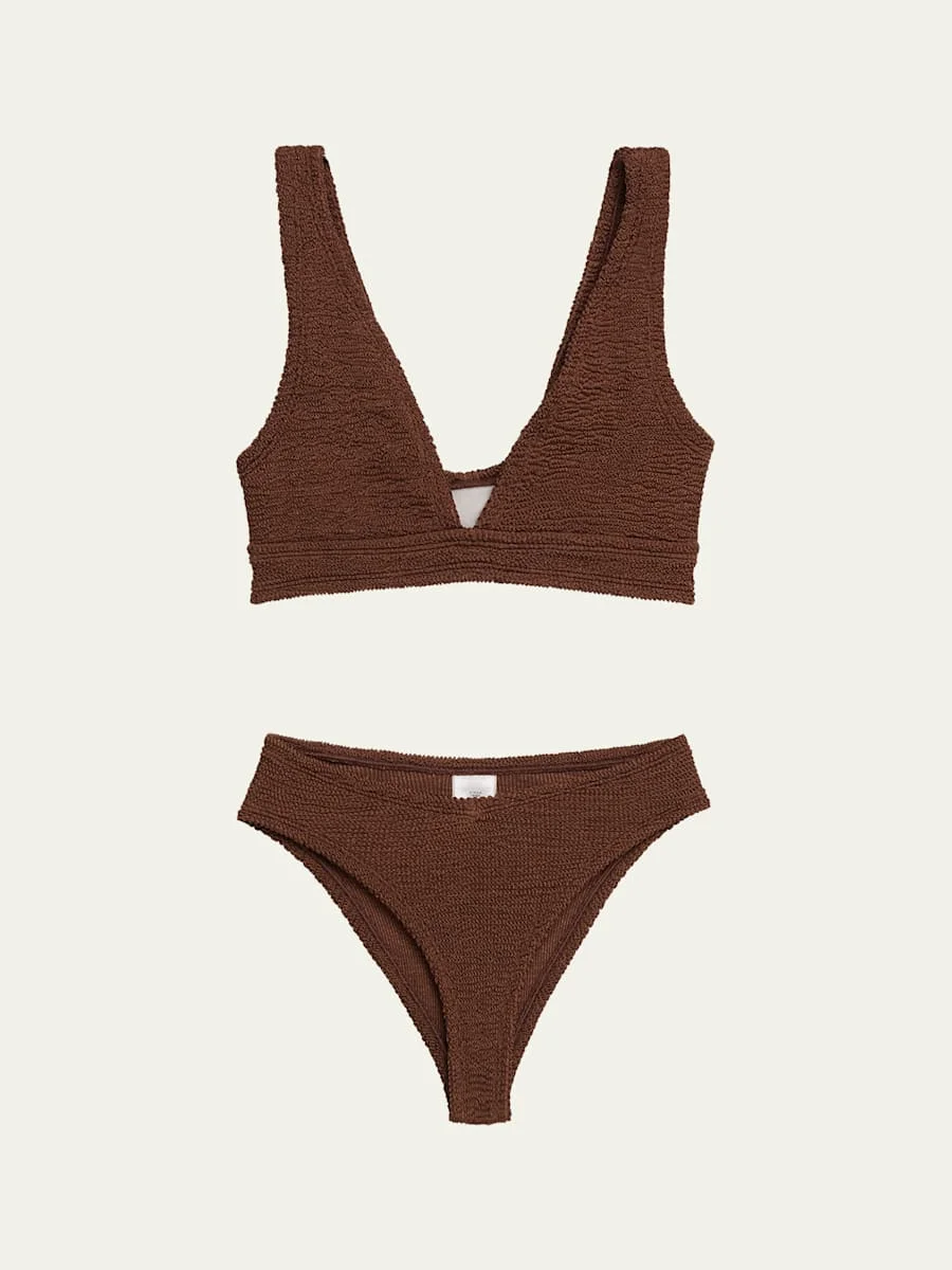 The "Angel" twopiece bikini set by Hunza G is crafted from The Original Crinkle™ fabric V neckline Fixed shoulder straps Pullover style Midrise hipster style Moderate seat coverage One size fits most Polyamide/elastane Made in Morocco