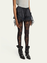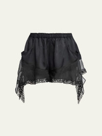 Isabel Marant "Ildana" silk shorts trimmed with embroidered lace and sheer organza ruffles High-rise sits high on the hips Elasticized waistband Pleated front Side slip pockets Wide-leg fit Pull-on style Silk/elastane Dry clean Imported Online Inquiries: BGS21_BB0XN| Store Inquiries: #5423652