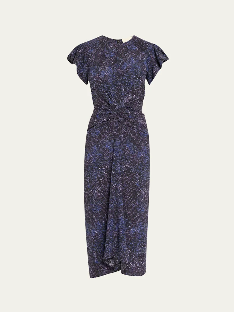 Isabel Marant "Terena" stretch silk dress featuring a mosaic print and waist gathering detail Round neckline Short puff sleeves Sheath silhouette Hem falls below the knee Back zip Silk/elastane Dry clean Made in Romania Online Inquiries: BGS21_BA6WQ| Store Inquiries: #5042822