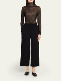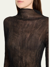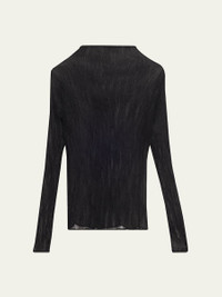 This top by Issey Miyake is crafted from semisheer fabric with a plisse, twisted texture High neckline Long sleeves Slim fit Hip length Pullover style Polyester Made in Japan