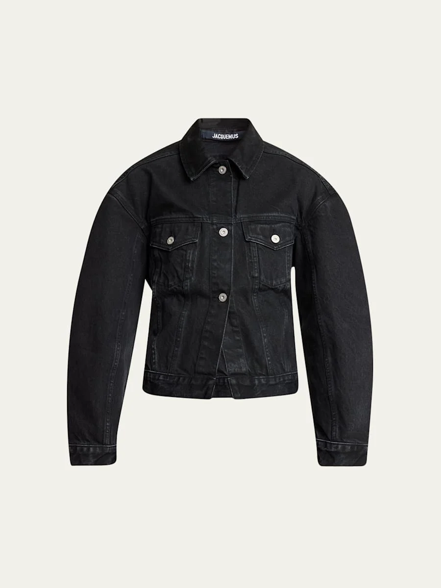 Jacquemus "De-Nimes" denim jacket featuring a cinched waist with a back button-tab detail Point collar; single-breasted front Long sleeves; button cuffs Chest button-flap pockets Slim fit Hip length Cotton Dry clean Made in Italy Online Inquiries: BGS21_BA9E0| Store Inquiries: #5060825