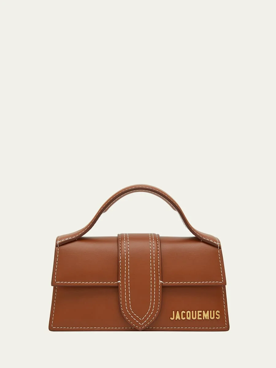 Jacquemus "Le Bambino" shoulder bag in supple leather with contrast topstitching Features signature logo lettering on corner Flat top handle Detachable, adjustable crossbody strap Flap top with magnetic closure Exterior, back slip pocket Interior, one slip pocket Lining: Cotton Approx. 5.5"H x 6.8"W x 3.5"D Made in Australia
