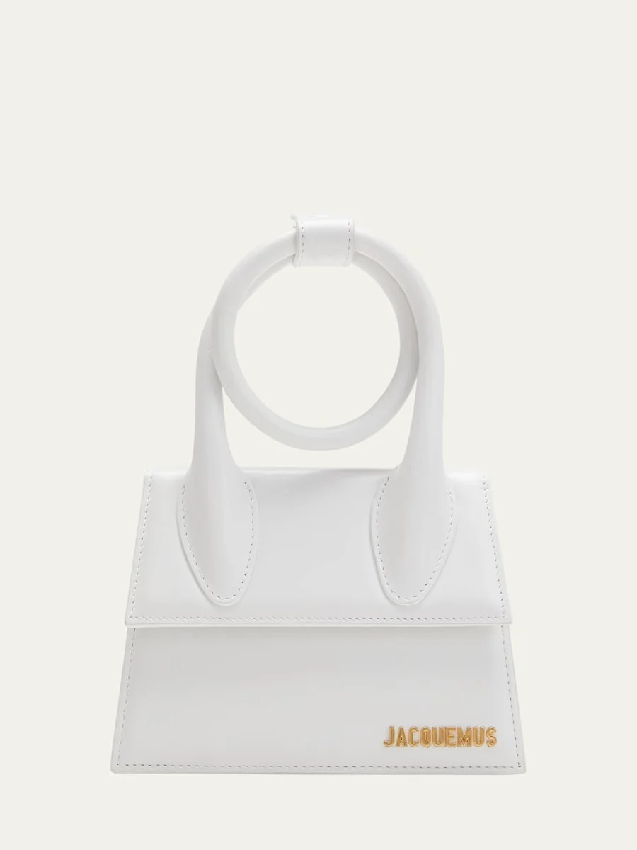 Jacquemus structured top handle bag in smooth leather Features metal logo lettering on corner Knot rolled top handle with snap closure Detachable, adjustable crossbody strap Flap top with magnetic closure Approx. 5.5"H x 7"W x 3.3"D "Le Chiquito Noeud" is made in Italy Online Inquiries: BGS21_V59CT| Store Inquiries: #4192120