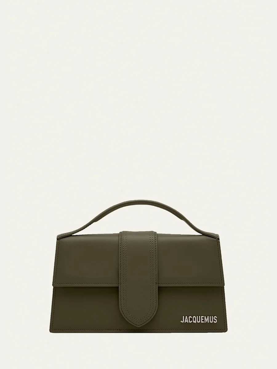 Jacquemus "Le Grand Bambino" crossbody bag in leather, cotton, and zinc alloy hardware Features signature logo lettering on corner Flat top handle Detachable, adjustable crossbody strap Flap top with magnetic closure Exterior, back slip pocket Interior, one slip pocket Lining: Cotton Approx. 5.5"H x 9.1"W x 2.8"D Made in France