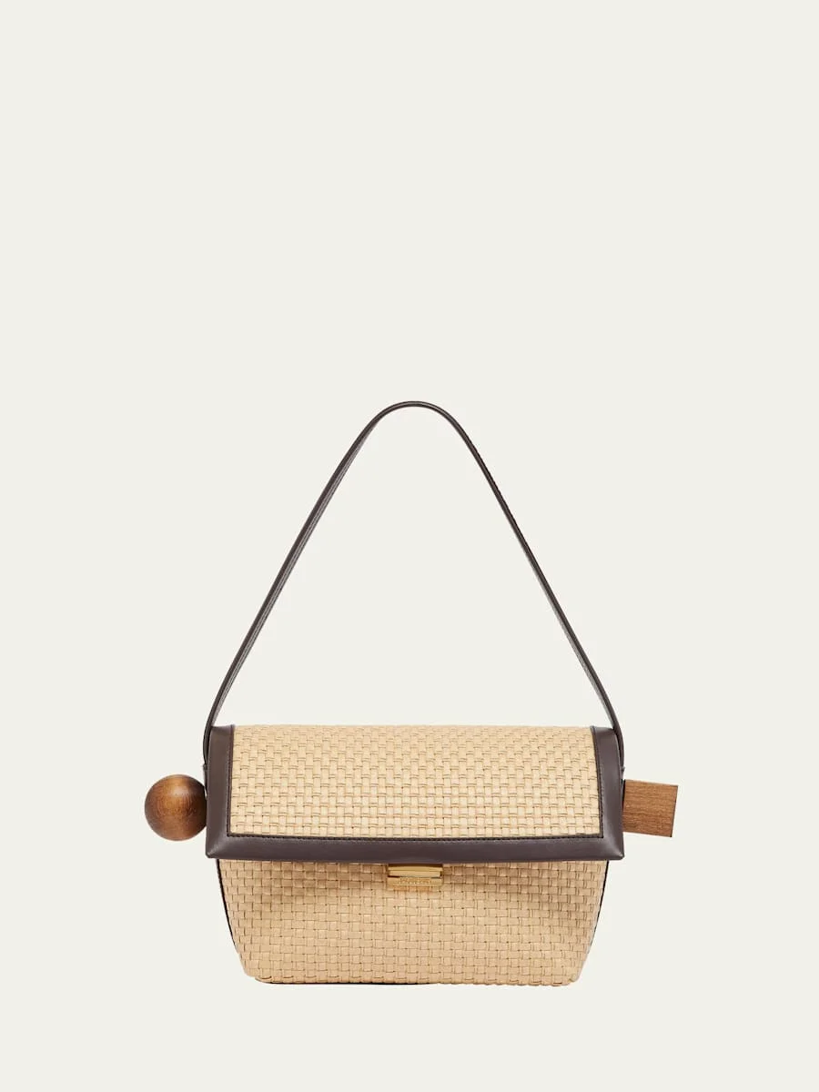 Jacquemus "Le Rond" shoulder bag in raffia-like nylon Shoulder strap with geomoetric shaped accents Flap top with push-lock closure Divided compartment interior; one zip pocket and one card slot Lining: Cotton Approx. 6.3"H x 10.4"W x 4.5"D Made in Italy Online Inquiries: BGS21_V6F57| Store Inquiries: #4956090