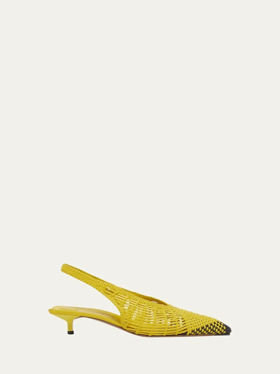 Jacquemus pumps in woven leather 1.50 in / 40 mm kitten heel Pointed toe V vamp Stretch slingback strap Leather outsole Lining: Leather Made in Italy Online Inquiries: BGS21_X6SHG| Store Inquiries: #4936771