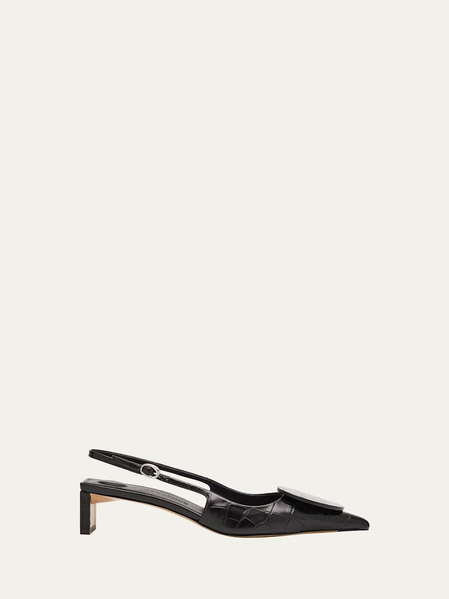 Adorned with statement circular and square decorative accents, these pumps by Jacquemus are crafted from croc-embossed Italian calf leather 1.50 in / 40 mm kitten heel Pointed toe Buckle slingback strap Cushioned insoles for added comfort Leather lining and outsole Made in Italy Online Inquiries: BGS21_X6Y0Z| Store Inquiries: #5047436