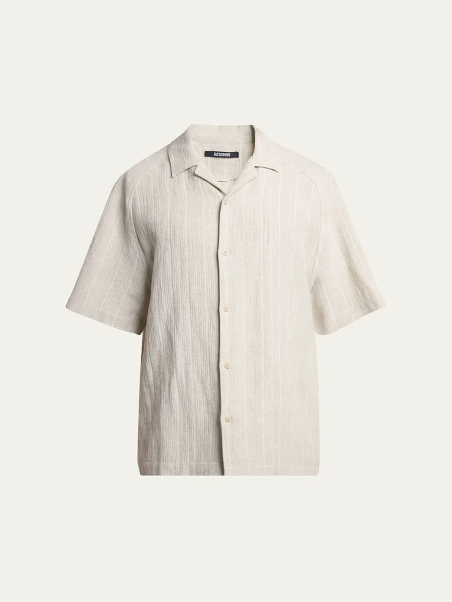 Jacquemus camp shirt in a lightweight cotton and linen blend highlighted with herringbone-woven stripes Notch collar Button placket Short sleeves Back yoke with J loop Straight hem Boxy fit Cotton/linen Made in Portugal Online Inquiries: BGS21_NDMAM| Store Inquiries: #5047831