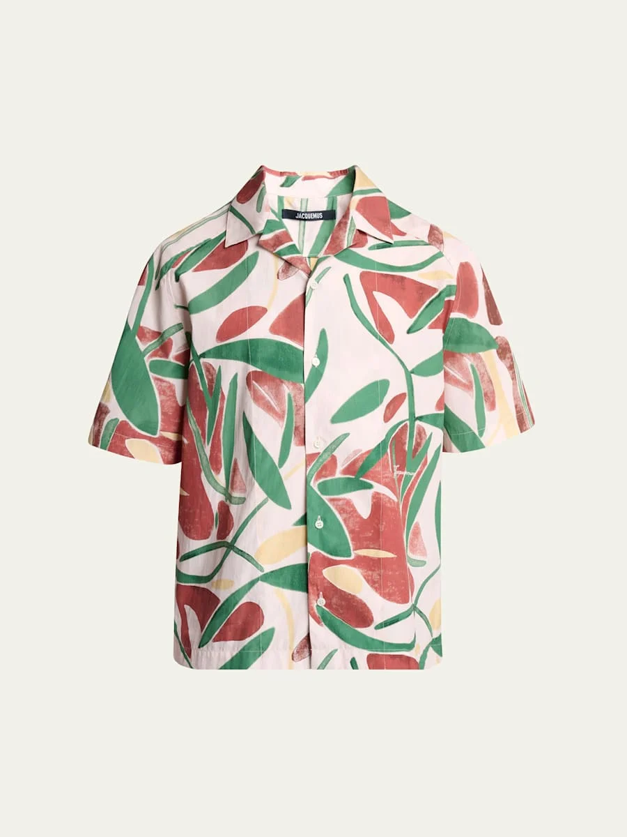 Jacquemus camp shirt in crisp cotton showcasing a large abstract pattern Logo signature on the front Notch collar Button front Short sleeves Back yoke with J loop Straight hem Boxy fit Cotton Made in Portugal