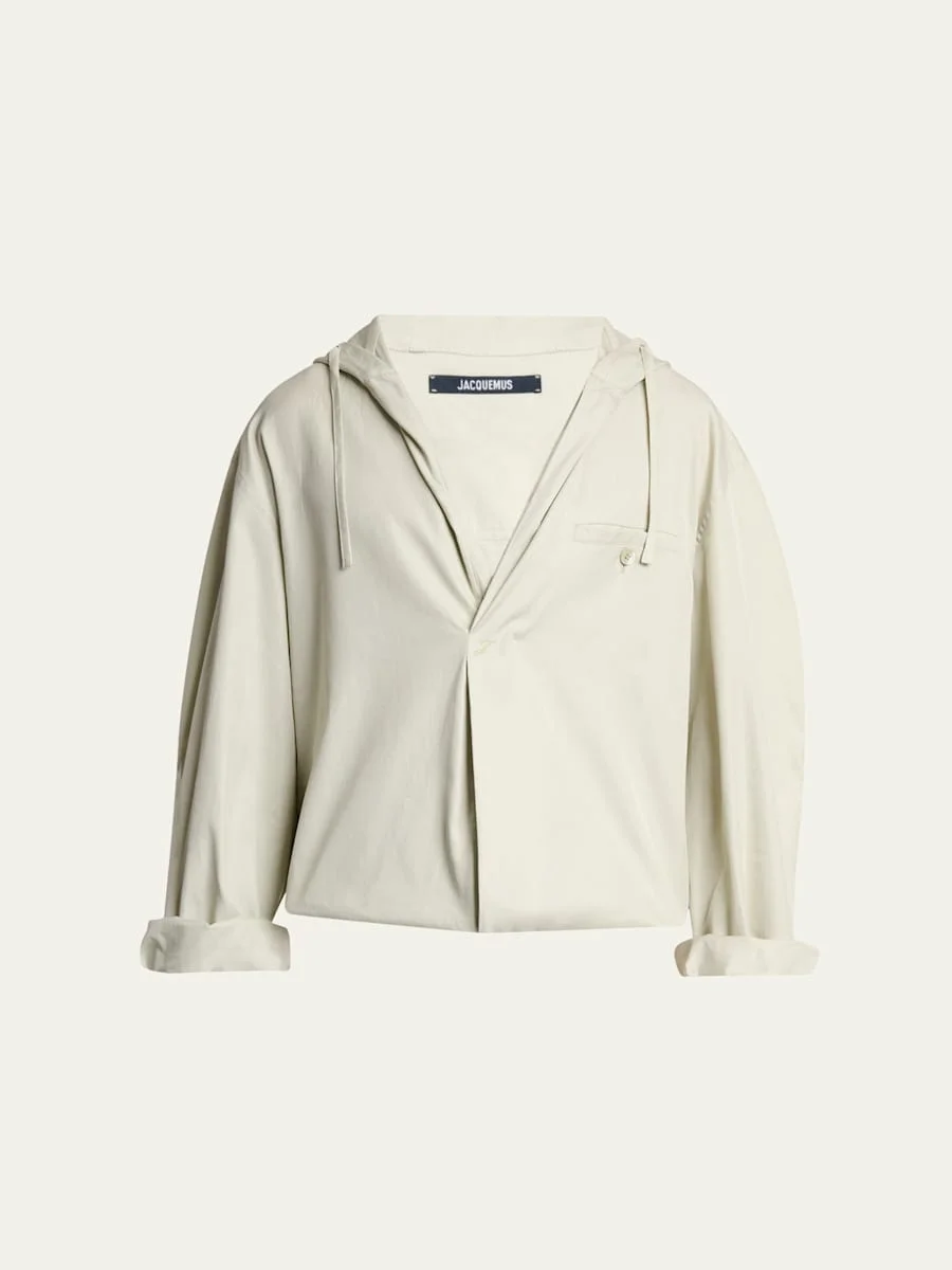 Jacquemus casual button-down shirt in crisp cotton defined by a drawstring hood V-neckline with J logo Buttoned chest pocket Long sleeves Rolled cuffs Relaxed fit Cotton Made in Bulgaria Online Inquiries: BGS21_NDMAR| Store Inquiries: #5047836