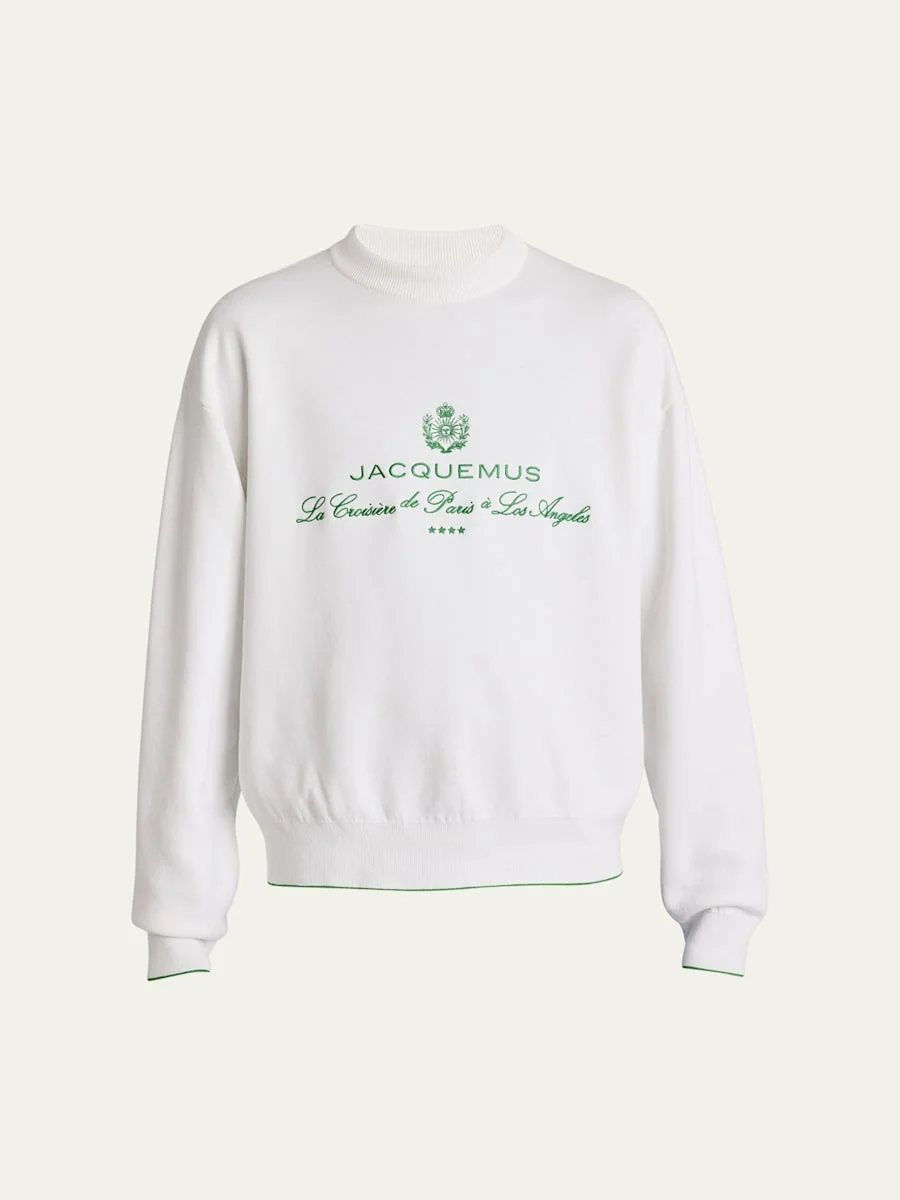 Jacquemus "La Maille Venice" sweater featuring an embroidered logo motif at front Crew neckline Long sleeves Ribbed cuffs and hem with tipping Pullover style Cotton/viscose/nylon Made in Italy Online Inquiries: BGS21_NCRGH| Store Inquiries: #4935971