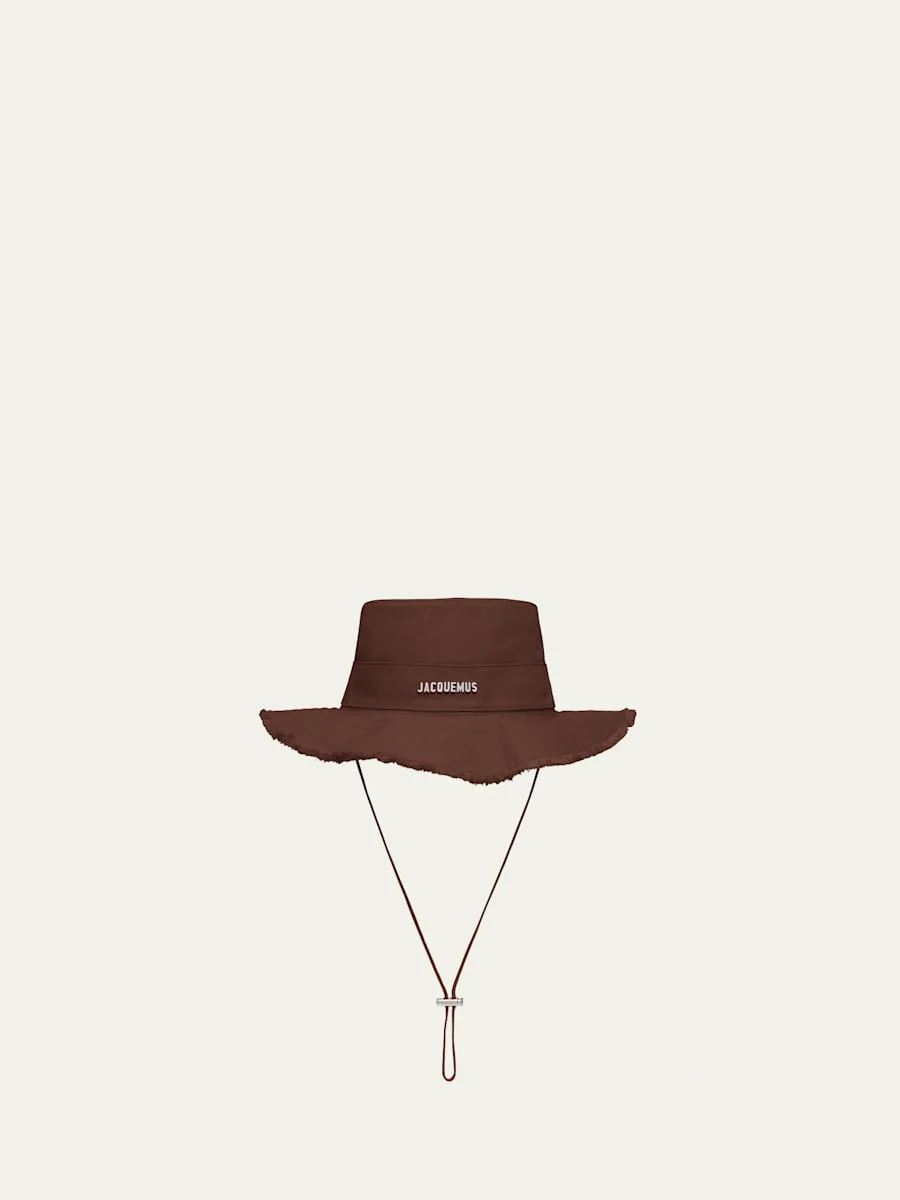 Jacquemus expedition hat in cotton Silvertone logo on front Flat crown Downturn stitched brim with fraying Long adjustable chin strap Cotton Made in Bulgaria Online Inquiries: BGS21_NCW71| Store Inquiries: #4963035