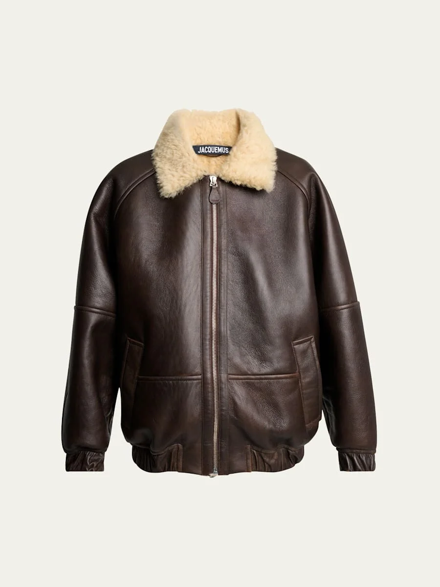 Jacquemus leather bomber jacket lined with luxuriously soft bleached and dyed shearling (France) Spread collar; zipfront Long raglan sleeves with elastic cuffs Side slip pockets Oversized fit Elasticized hem Leather Professional cleaning recommended Made in France
