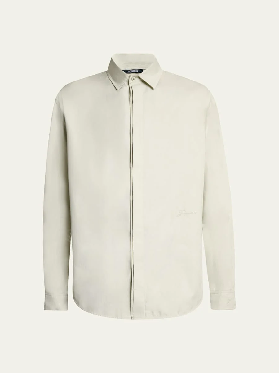 Jacquemus sport shirt in herringbone-woven cotton detailed with a concealed button placket Spread collar Logo signature on the front Long sleeves Concealed round barrel cuffs Pleated back yoke Shirttail hem Cotton Made in Portugal Online Inquiries: BGS21_NDMAU| Store Inquiries: #5047842