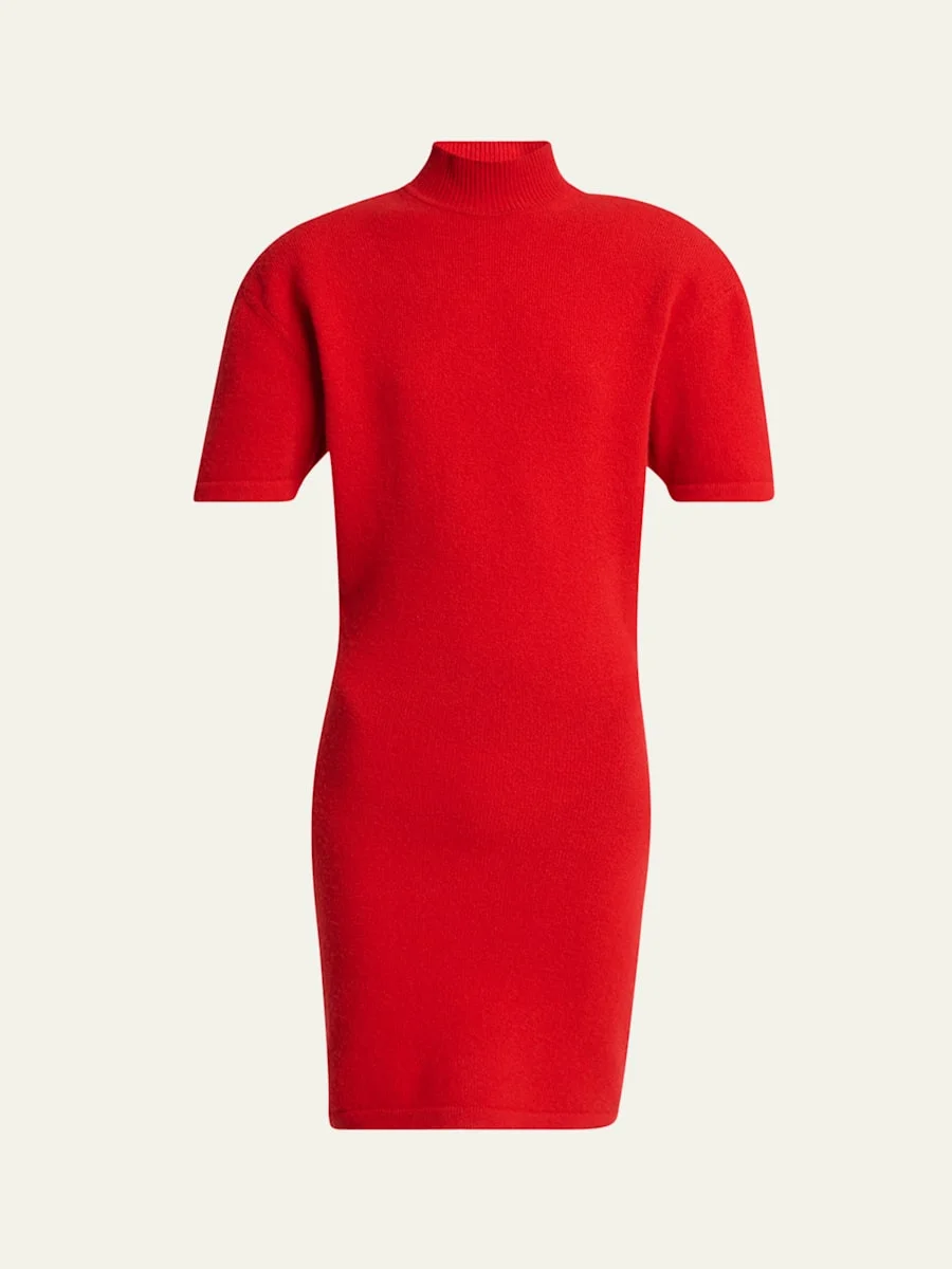 Jacquemus "The Castagna" knit dress enhanced with structured shoulders Turtleneck Short sleeves Figurehugging silhouette Hem hits around the knee Slipover style Merino wool/nylon/polyamide Dry clean Imported