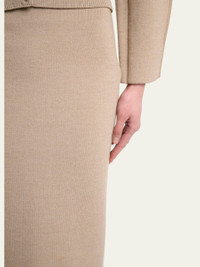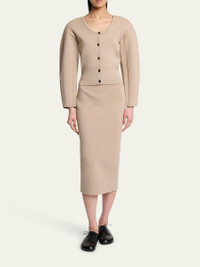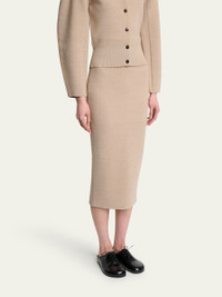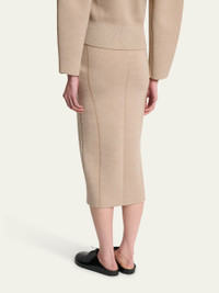 Jacquemus "The Doppio" knit midi skirt with top stitching High rise Wide elastic waistband Pencil style Hem falls below the knee Pull-on style Merino wool/nylon/polyamide/elastane Dry clean Imported Online Inquiries: BGS21_BA9DS| Store Inquiries: #5060817