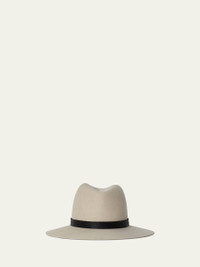 Janessa Leone "Corinne" fedora hat in soft-structured wool Brim, 3"L Pinched crown Belt leather accent trim Item Weight (Lbs.): 3.1 Spot clean Made in USA Online Inquiries: BGS21_D51M2| Store Inquiries: #4885263