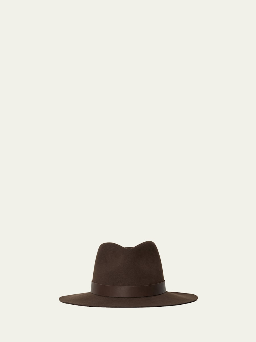 Janessa Leone "Ross" packable fedora in virgin wool Pinched, geometric crown Band on break Flat, wide brim Spot clean Made in USA Online Inquiries: BGS21_D4SQ1| Store Inquiries: #4665531