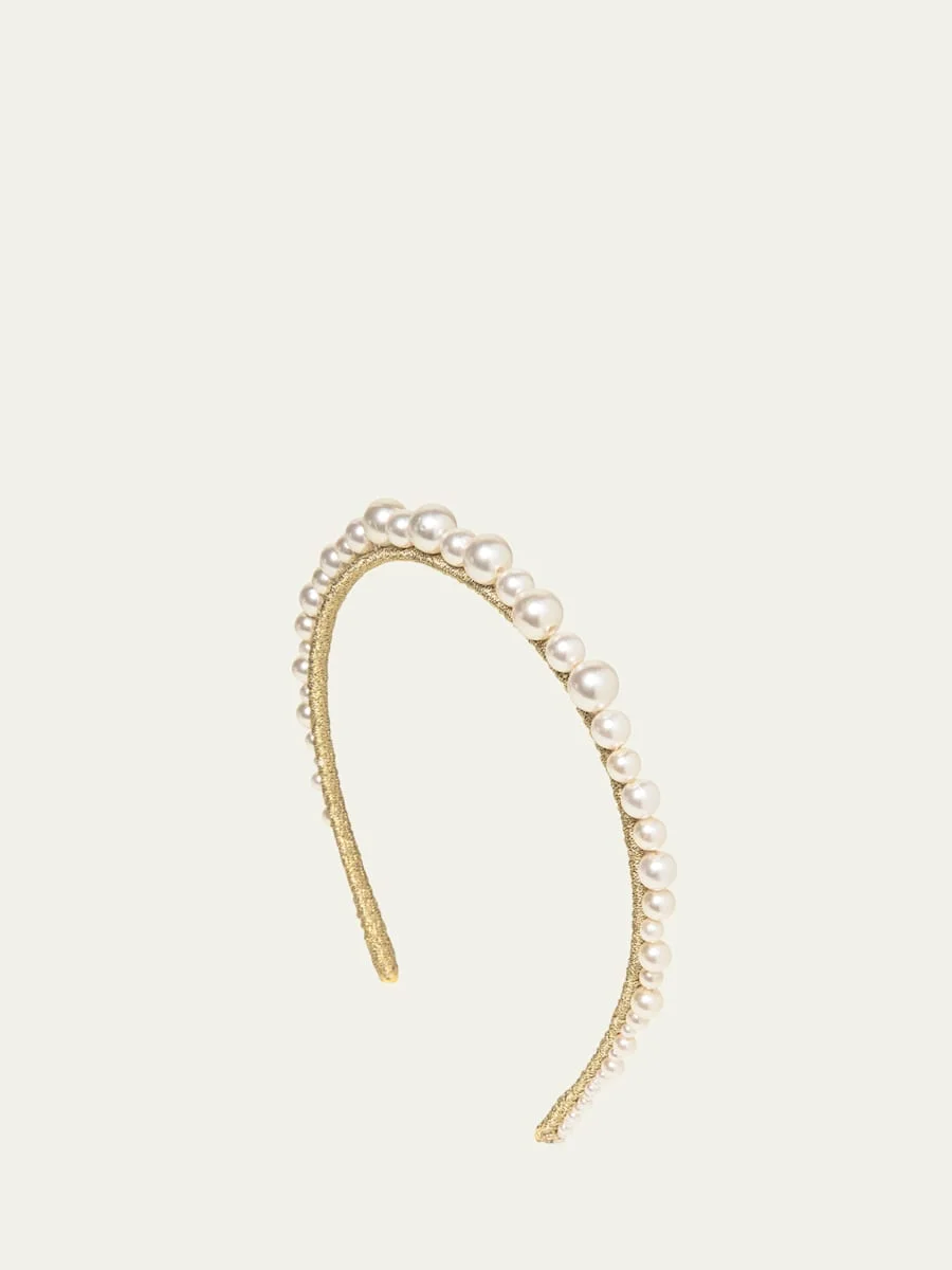 Jennifer Behr "Belladonna" headband in gold-tone wrapped gold plated wire silk and glass faux pearls We recommend storing headbands in their dust bag while not in use. Avoid contact with water, perfume, and other chemicals, including hairspray, which should be used only before placement in the hair. Made in USA Online Inquiries: BGS21_D536S| Store Inquiries: #4926862