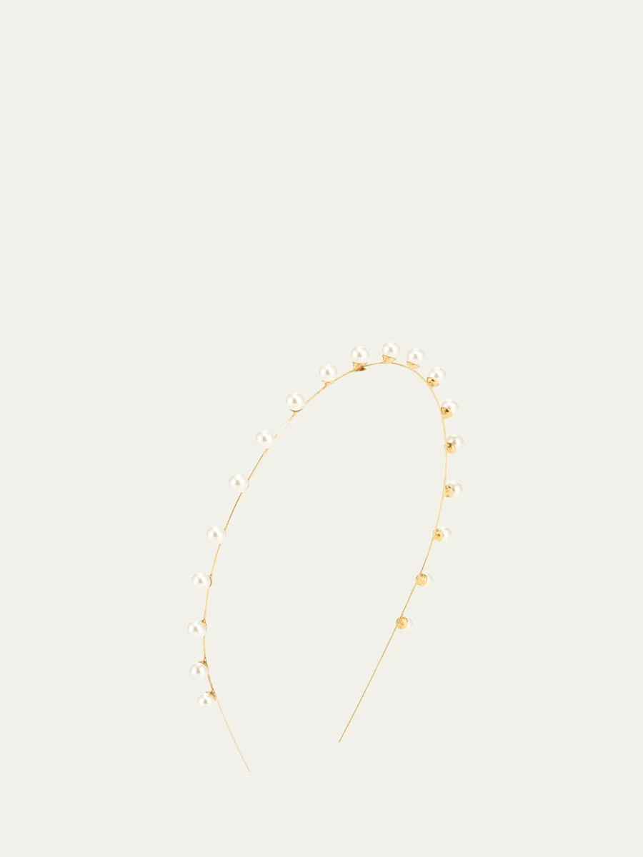 Jennifer Behr "Ines" skinny headband with Swarovski® pearl beading. Approx. measurements: 7"W x 1"D x 7"T. Gold tone plated steel. Made in USA. Online Inquiries: BGS21_D3KPA| Store Inquiries: #3299701