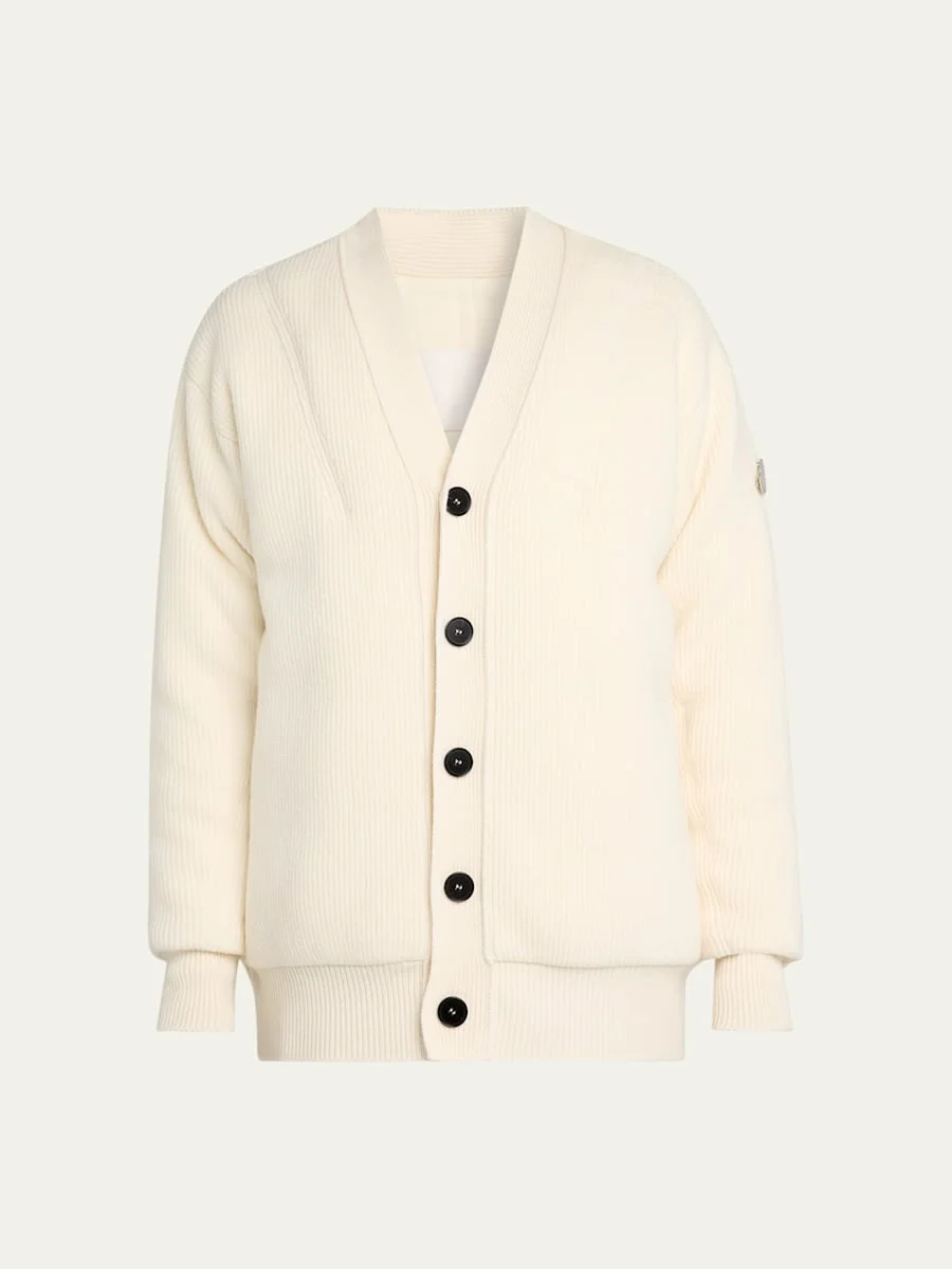The Moncler Genius x Jil Sander collaboration virgin wool cardigan offers classic ribbing accented with contrasting buttons. Jil Sander is the epitome of modernity, combining elegance and purity with innovative materials and exceptional quality. Vneckline Button front Long sleeves Ribbed cuffs and hem Classic fit Virgin wool Made in Romania