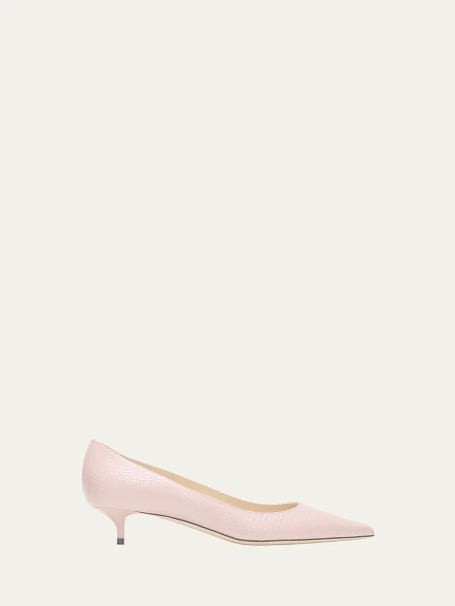 Jimmy Choo "Amelia" lizard-embossed leather pumps 1.38 in / 35 mm kitten heel Pointed toe Slip-on style Leather outsole Lining: leather Made in Italy Sizing note: Jimmy Choo runs small. We suggest that you order a half size larger than you typically wear. Online Inquiries: BGS21_X6LQA| Store Inquiries: #4805196