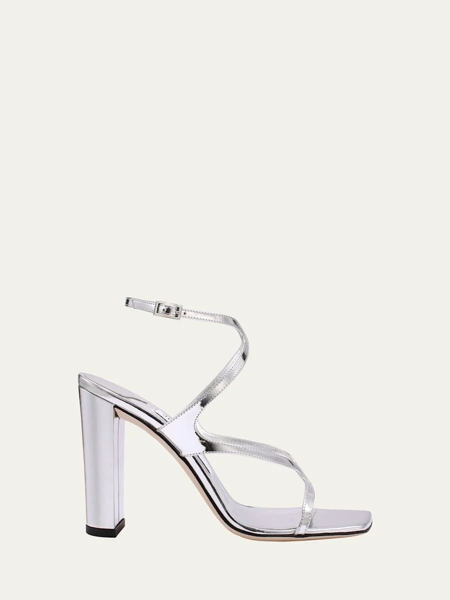 Jimmy Choo "Azie" metallic leather sandals 3.25 in / 85 mm block heel Single strap bands open toe Straps merge at vamp Adjustable ankle strap Lining: Leather Leather outsole Made in Italy Online Inquiries: BGS21_X6QYK| Store Inquiries: #4895410